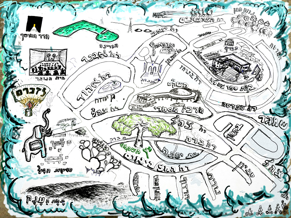 זהו דף המקומות הציבוריים של השכונה, מפה נוסטלגית בה מצויים בו כול מוסדות השכונה שמפעם, - בית הספר, צריף הצופים, הבריכה, המרכז המסחרי, אנדרטת הזיכרון לנופלים וכיוב'. איתם מופיעים במפה כול האתרים שהיו חלק מעולמם של ילדי השכונה ונעלמו בצוק העיתים - "חדר החושך" (שעל חורבותיו עומדת היום מסעדת "פטלינה") "תחת הענק" שהפך לדרך דבורה הנביאה, "הפיל" "הכיפות" ועוד. לחיצה על כול אחד מהציורים במפה תעלה את הסיפור שלו.